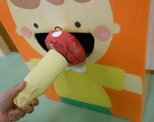 すべて収穫が終わるとゴールで待っていたのはパクパクちゃん♪収穫した食べ物はパクパク人形に食べさせてあげました😊